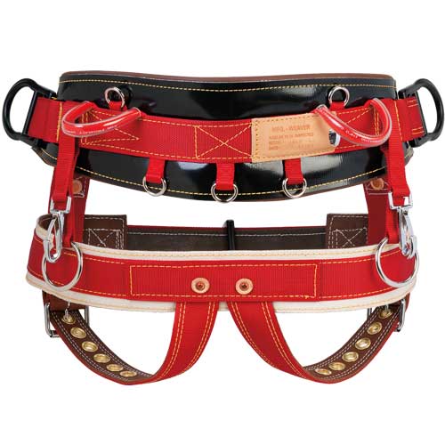 Offers freedom of movement with two floating Dees. Two floating Dees perfect for split-tail climbing. Front strap is reinforced with neoprene for extra durability. Extra wide back pad is foam filled and leather lined. The 2" wide nylon leg straps fea ture forged buckles and are leather lined for extra comfort. New CE approved design for added safety. Saddle backs feature five rounded nylon loops that hold up to 15 lbs. of accessories.